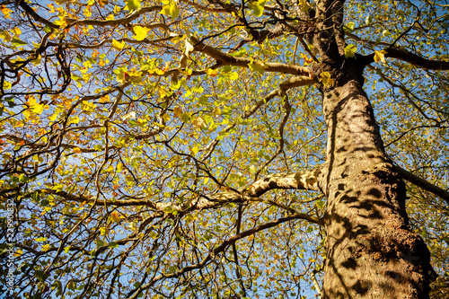 tree, green, branch, tree branch, background, autumn, autumn, reaching, light, bright, blue skies, britain, british, britain, foliage, nature