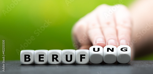 Symbol für den Traumberuf. Hand dreht Würfel und ändert das Wort "Beruf" in "Berufung".