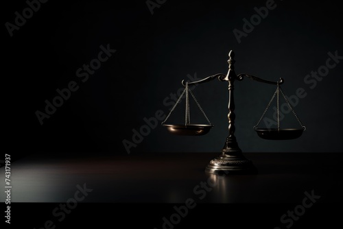 Symbol of Justice: Scales in the Spotlight. A focused light illuminates the scales of justice, emerging from darkness, symbolizing balance and fairness in the legal system.