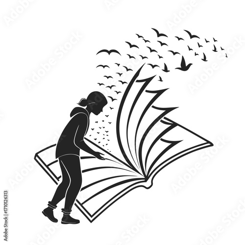 Symbolic black silhouette of a person reading, with knowledge and dreams flying from the book like birds, representing education and future aspirations