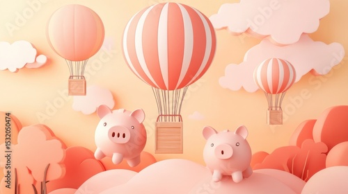 Symbolic illustration of piggy banks as hot air balloons flying away with savings