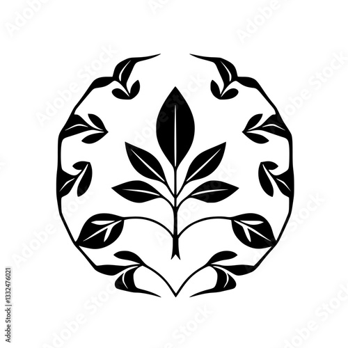 Symmetrical Black Leaf Emblem: Stylized Illustration of Plant Forms Within an Octagon, Nature's Symbolic Harmony, Clean Modern Design.