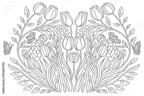 tulip, floral, colouring, line art, pattern, symmetric, botanical, floral pattern, spring, heart-shaped, butterfly, leaf, branch, background, printable, digital artwork, vector, graphic design, template, copy space, illustration