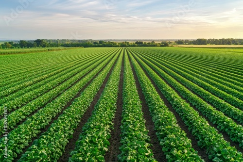 Symmetrical Green Crop Rows in Serene Agricultural Landscape at Sunrise - Lush Farm Field with Vibrant Crops and Rolling Hills, Ideal for Nature, Farming, and Sustainability Concepts