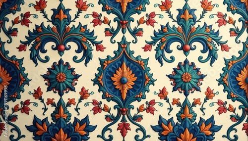 Symmetrical paisley damask pattern with swirling vines and intricate details in muted tones , surface, vintage