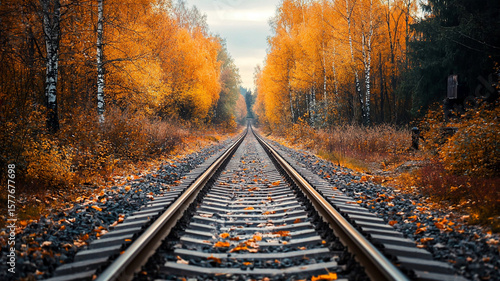 Symmetrical railway leading through colorful autumn trees. Seasonal journey and travel concept.