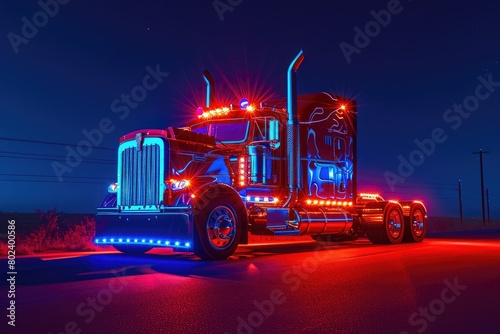truck, red, blue, chrome, retro, vintage, classic, vehicle, road, highway, transport, urban, city landscape, neon, light, night, skyline, futuristic, style, design, art, graphic, illustration, digital, technology, creative, cool, trendy, hip, modern, sleek, edgy, fast, speed, motion, power, energy, excitement, adventure, explore, journey