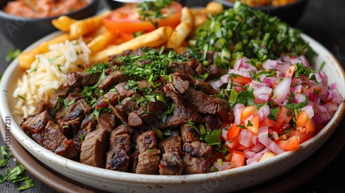 Syrian shawarma plate garlic sauce pickles and fries plated cleanly on white ceramic