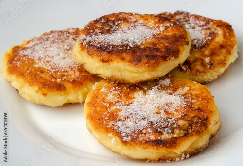 Syrniki (cottage cheese pancakes or curd fritters) in a white ceramic bowl, Healthy food. Food close-up.