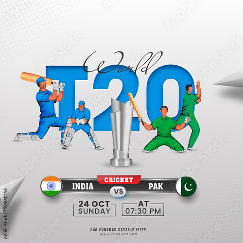 T20 World Cricket Poster Design With 3D Silver Trophy Cup, Cricketer Players And Participating Team India VS Pakistan On Grey Background.