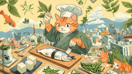 tabby cat chef prepares sushi with fresh fish in vibrant kitchen scene. playful atmosphere features various ingredients and city views