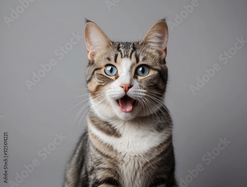 cat, tabby, blue, eye, mouth, open, animal, pet, felino, fur, white, brown, grey, whisker, nose, tongue, cute, adorable, playful, curious, happy, surprised, excited, funny, portrait, closeup, background, studio, indoor, domestic, mammal, companion, furry, striped, soft, fluffy, paw