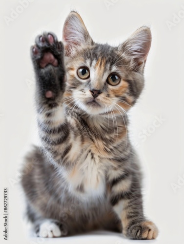 Tabby Kitten Reaching Up with Paw on White Background