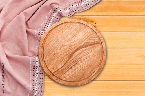Table cloth and pizza board on vintage wooden table. Top view mockup