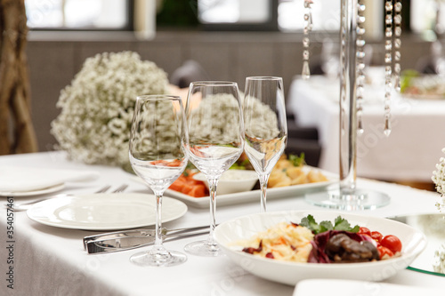 table, eatery, food, dinner, banquet, wedding, meal, wine, plate, glasses, lunch, dish, dining, party, celebration, luxury, white, setting, event, salad, catering, drink, napkin, decoration, service, reception, arrangement, tablecloth, flower, elegance, elegant, fancy, fine, place, romance