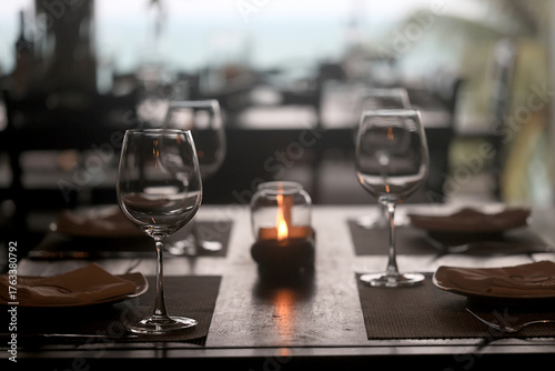 table setting in the restaurant, glasses and cutlery, a clean new table in the restaurant is waiting for guests, a free table