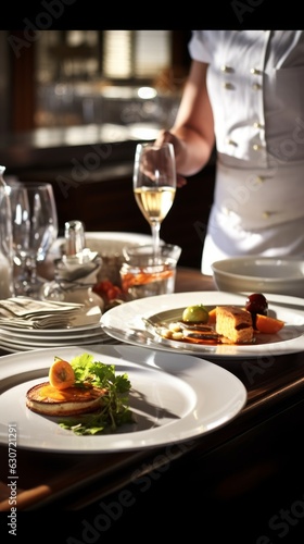 Table setting with plate in fine dining restaurant. The lighting is moody.