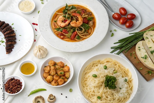 table, variety, food, including, pasta, shrimp, vegetable, bowl, several, meal, plate, delicious, lunch, spoon, dinner, also, knife, dish, visible, healthy, cookery, fresh, epicure, background, tasty, noodle, traditional, spaghetti, seafood, prawn, asian, sauce, thai, italian, white, pepper, spicey, cooked, green, red, chili, eatery, homemade, hot, basil, herb, receipe, asia, parsley