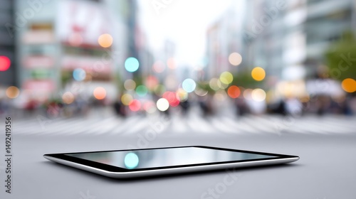Tablet is placed on a grey surface in a busy city street. The tablet is the main focus of the image, and the surrounding environment is blurry and hazy, giving the impression of a busy