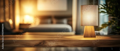 Table-top view of beside table or nightstand on blurred cozy night ambiance at hotel room with bokeh background. Empty wooden table for product display and customization