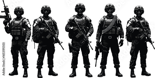 Tactical Soldier Silhouette Set—Five Armed Figures in Military Gear with Helmets, Vests, and Rifles for Combat, Defense, and Strategy Themes