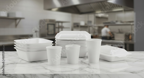 Takeaway food packaging set including disposable containers, bowls, and cups on a marble surface with a blurred kitchen background