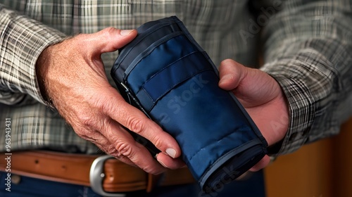 Taking Blood Pressure: Doctor's hands wrapping a blood pressure cuff around a patient's arm and inflating it.