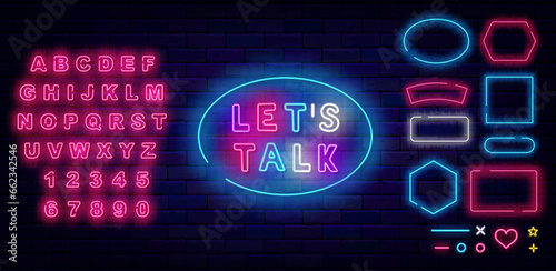 Talk show neon signboard. Geometric frames collection. Shiny pink alphabet. Colorful text. Vector stock illustration