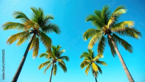 Tall coconut palms against a vibrant blue sky, leaves, clouds