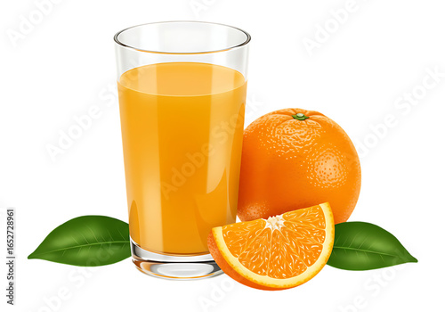 Tall glass of fresh orange juice with whole orange and slice isolated on transparent background