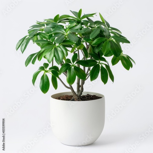 Tall schefflera in a white minimalist pot isolated on a solid white background