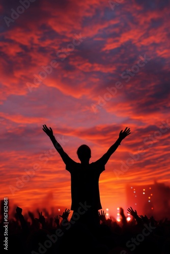 concert, person, shoulder, standing, hand, raised, air, crowd, music, festival, performance, nightlife, party, event, culture, lifestyle, energy, atmosphere, celebration, people, movement, freedom, passion, rythm, stage, entertainment, youth, modern, dynamic, silhouette, vibrant, illuminated, glowing, sound, perspective, detail, creativity, artistic, joy, fun, night, background, scene, expression, excitement