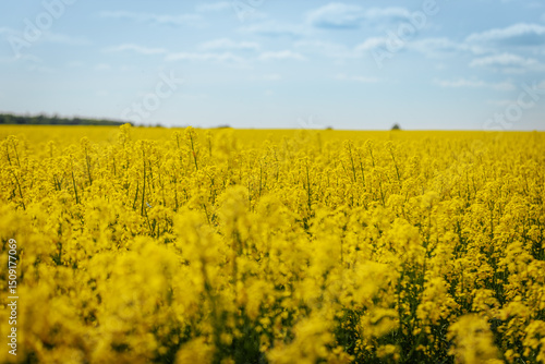Tall yellow rapeseed flowers in full bloom rise toward a soft blue sky with light clouds, creating a vibrant and colorful agricultural landscape.
