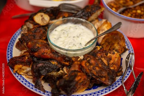 dip, seasoned, spiced, meat, chicken, celebration, india, culinary arts, baked, asian, cater, cucumber, party, food, burnt, traditional, holiday, closeup, indian food, asian cuisine, indian, creamy, spicey, charred, thigh, buffet, tandoori, utensil, leg, culinary, catered, plated