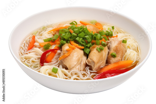 tantalizing bowl of chicken noodle soup, filled with tender chicken chunks, colorful vegetables, and clear broth, set against a white backdrop.