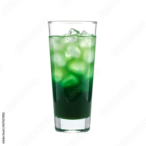 Tantalizing layered cocktail in a sleek glass marrying deep green with a crystal clear top exuding elegance and refreshment, isolated