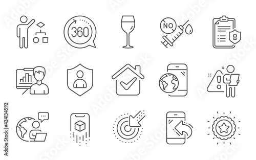 Targeting, Wine glass and Augmented reality line icons set. Incoming call, Security and Privacy policy signs. 360 degrees, Mobile internet and Presentation board symbols. Line icons set. Vector