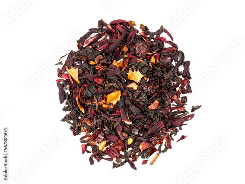 Tas de feuilles de thé noir avec des morceaux de fruits rouges séchés - texture vu du dessus en haute définition - macro photographie