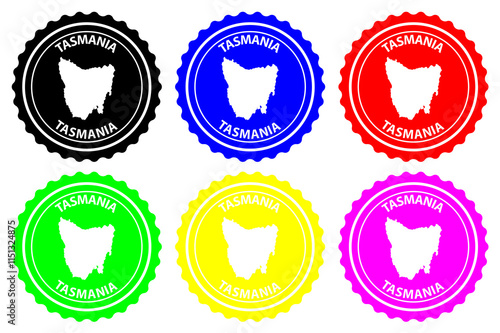 Tasmania - rubber stamp - vector, Tasmania map pattern - sticker - black, blue, green, yellow, purple and red