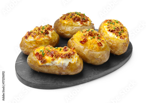 Tasty baked potatoes with stuffing isolated on white