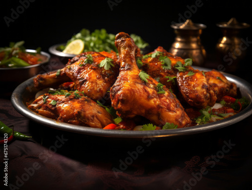 Tasty butter chicken curry dish from Indian cuisine. Hot spicy chicken tikka masala in bowl. Chicken curry with rice, indian naan butter bread, spices, herbs.