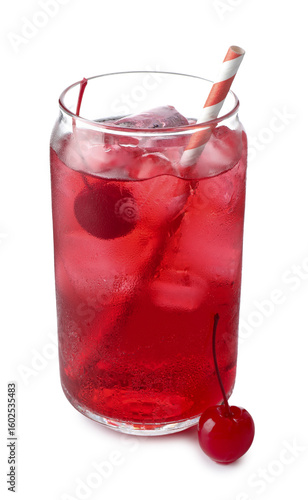 Tasty cherry soda water with ice cubes and berries isolated on white