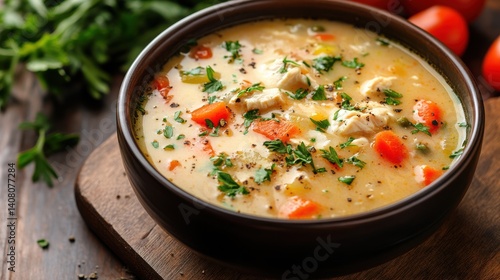 tasty chicken pot pie soup tastes just like the pie without having to make a crust closeup on the wooden board on the table horizontal top view from above,stock photo