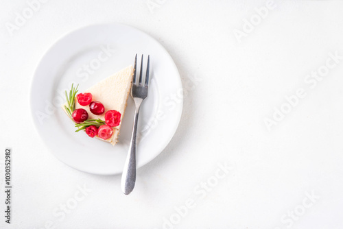 Tasty Christmas cheesecake with cranberries and rosemary decorated like Christmas wreath. Simple elegant winter white dessert