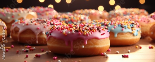 Tasty colorful donuts with sprinkles on a dark background. Generative AI.