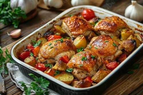 Tasty homemade pie with chicken and vegetables in baking dish on wooden table, closeup