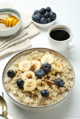 Tasty oatmeal with banana, blueberries, walnuts and honey served in bowl on white wooden table