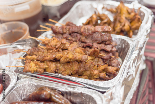 Tasty pork BBQ skewers in aluminum foil tray at local market in America