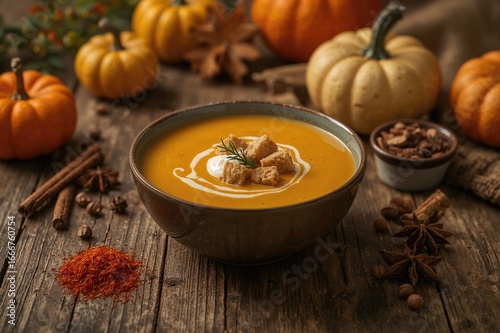 Tasty pumpkin bisque garnished with sour cream, crunchy croutons, and aromatic spices on a dining surface