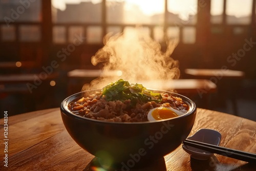 Tasty ramen bowl served on table, with warm steam and city view. Food photography
